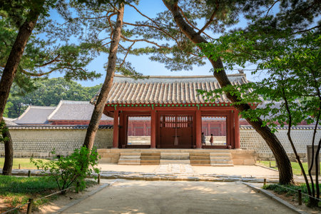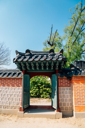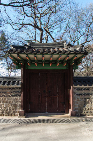 Injeongmun Gate of Changdeokgung Palace in Seoul, South Korea. Beautiful wooden gate of traditional Korean architecture. Changdeokgung Palace is a popular tourist attraction of Asia.