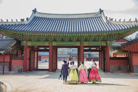 Seoul,South Korea-25 Apr 2019:Many tourists from all over the world are wearing Korean traditional costumes Hanbok to visit and take photos in Gyeongbokgung Palace.