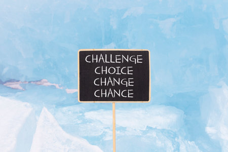 Challenge choice change chance symbol. Concept words Challenge choice change chance on beautiful blackboard. Beautiful blue ice background. Business Challenge choice change chance concept. Copy space.