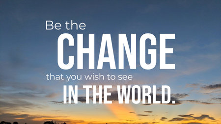An image with the motivational quote "Be the CHANGE that you wish to see IN THE WORLD" over a sky background at sunrise. The sky is blue and golden with sunlight rays and clouds.
