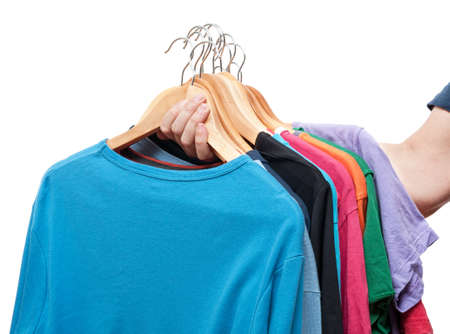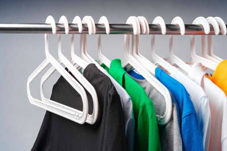 Colorful t-shirts and polo shirts. Preparation for the spring season. Shopping. Close-up. Clothing concept.