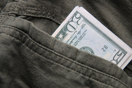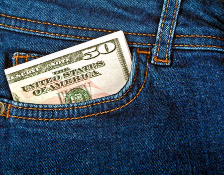 Background dollars sticking out of the back pocket of jeans shot closeup.