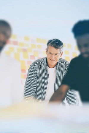 Women in their thirties and an older woman laughing, brainstorming around a glass board with notes