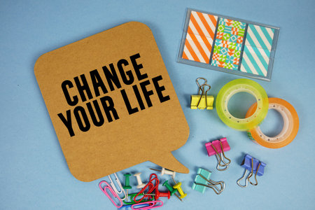 Pink paper with the text CHANGE YOUR LIFE on a white cup. Clock, pen on a yellow background.