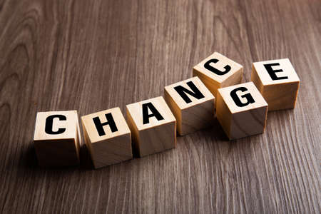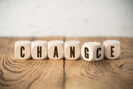 Word Change spelled with wooden dices with the dice carrying letter G turning to spell the word Chance.