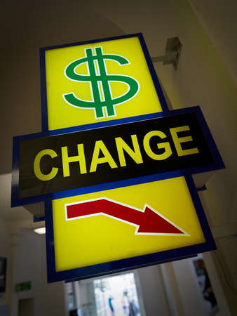KARLOVY VARY, CZECH REPUBLIC - SEPTEMBER 30, 2018: neon sign of an exchange office in front of a shopping center in Karlovy Vary in the Czech Republic