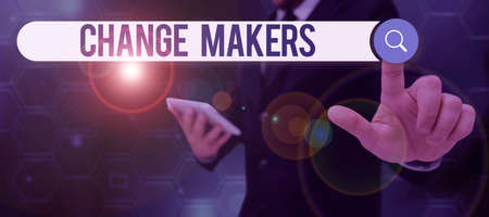 Hand writing sign Change Makers. Business overview Young Turk Influencers Acitivists Urbanization Fashion Gen X Businessman in suit holding tablet symbolizing successful teamwork.