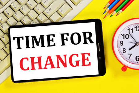 Time for change. Text message on the smartphone screen. The clock reminds you of the past and the future. Overcome obstacles, set goals, learn and work.