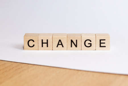 Wooden cubes, blocks with word Change in female hand. Conceptual image about human rights, education, social issues, mental health, education and personal development.