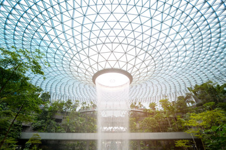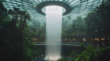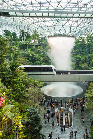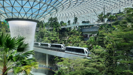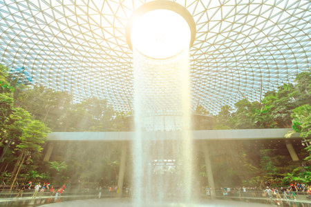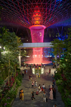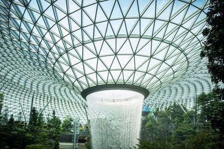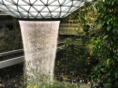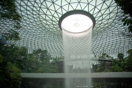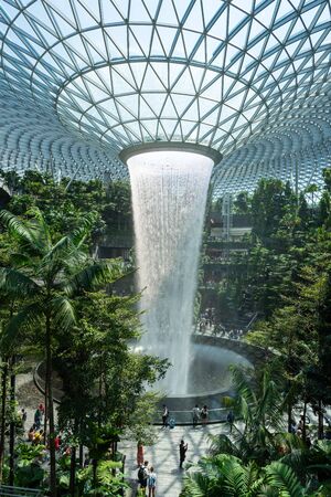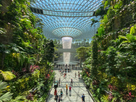 Jewel Changi Airport in Singapore City. Interior design decoration with waterfall, garden and trees. The world's best airport and destination