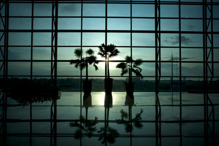 Silhouette of giant window and potted plants with its reflection at sunrise on a bright morning.