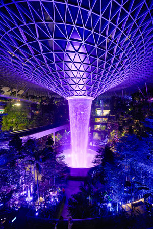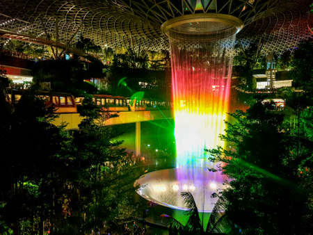 CHANGI, SINGAPORE - MAY 14, 2019 : Lighting show over the man-made waterfall at Jewel Department store in Changi Airport, Singapore