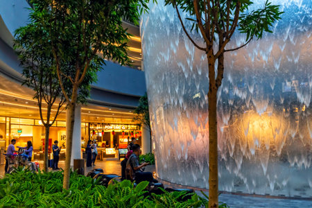 Jewel Changi Airport terminal interior in the evening. People walking, plants, waterfall and shops. Singapore, 2020-01-18.