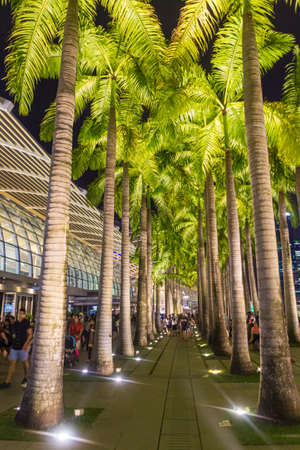 SINGAPORE, SINGAPORE - MARCH 11, 2018: Night view of the palm trees next to the Marina Bay Sands building in Singapore
