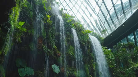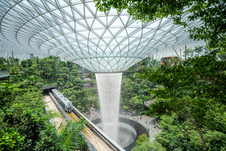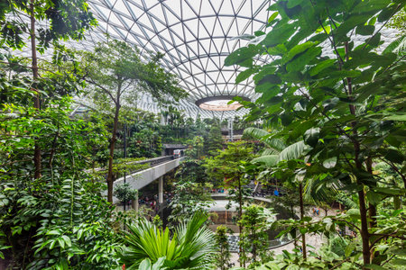 Singapore - May 31, 2024: Lush indoor tropical garden at Jewel Changi Airport in Singapore, showcasing a stunning blend of nature and modern architecture under a vast glass canopy