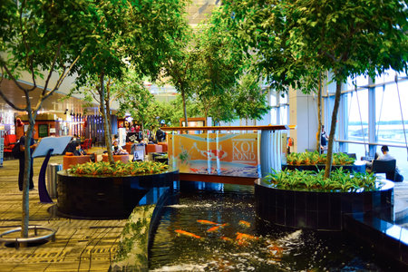 SINGAPORE - CIRCA APRIL, 2019: Koi Pond in Singapore Changi Airport, Terminal 3.