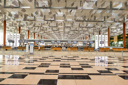 Singapore - January 2022: Singapore Changi Airport departure terminal architecture. Singapore Changi Airport is one of the largest airports in Asia.