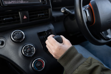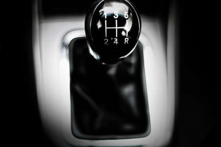 The driver hand is shifting the gears of a 6-speed manual transmission, panoramic banner with copy space on black background