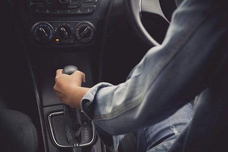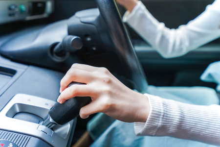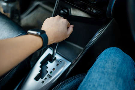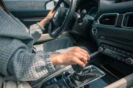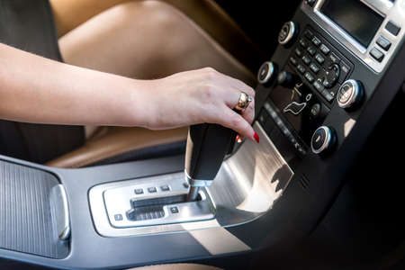 Close up of woman shifting gears on automatic gearbox and driving car. Female hand shifts the hydro sitting in a vehicle. Auto business, car sale, consumerism, transportation and travelling concept.