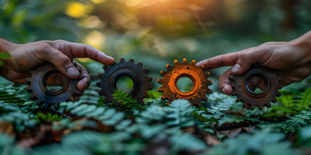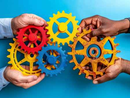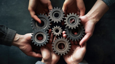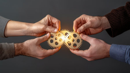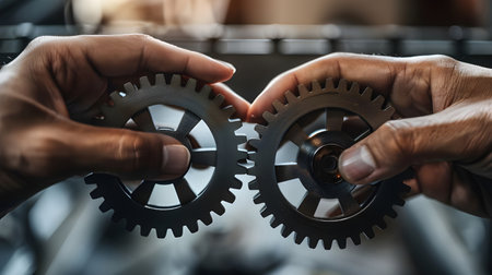 Two hands grasp interlocking gears, creating a powerful visual metaphor for teamwork and mechanical processes, set against a softly blurred background.