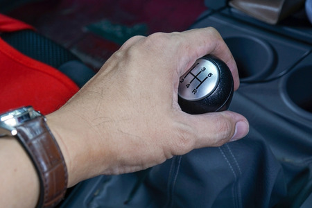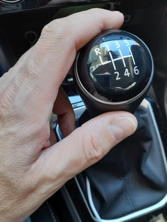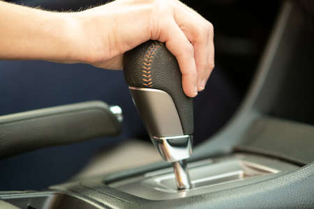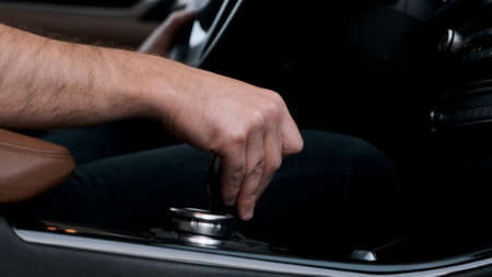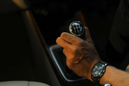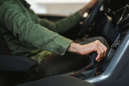 Unrecognizable young guy checking manual transmission in new car, going on test drive before auto purchase at dealership