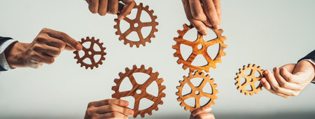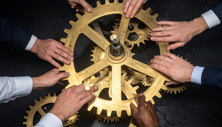 A diverse team of business professionals unites, their hands working in concert to turn a complex system of golden gears.