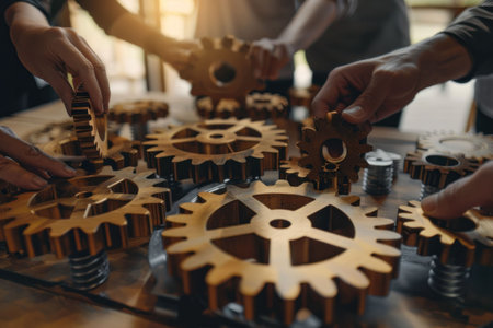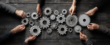 This image showcases multiple hands arranging metal gears on a wooden surface, suggesting collaborative effort. The composition features various sizes of gears, set against a backdrop of dark wood texture. It implies concepts of connection, teamwork, and problem-solving, suitable for various commercial applications.
