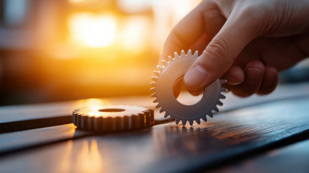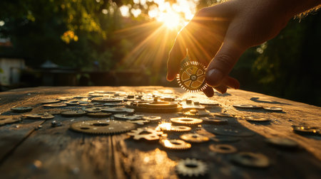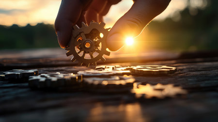 Industrial meets nature: gear on wood, hand, and glowing sunset