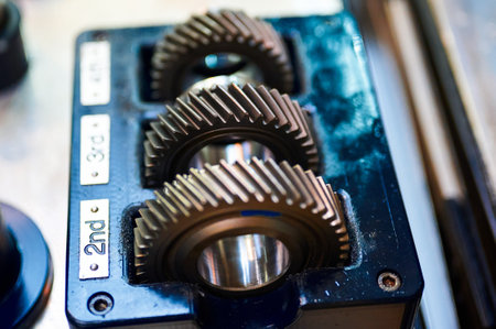 Close up of gears and bearings of modern industrial machine. Industrial background