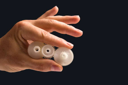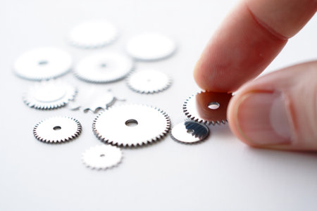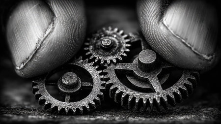 Two fingers delicately hold and interact with several metallic gears. The monochrome image showcases intricate details and textures. The composition utilizes shallow depth of field, emphasizing the gears against a blurred background. Suitable for conceptual illustrations, technical presentations, and various commercial applications.