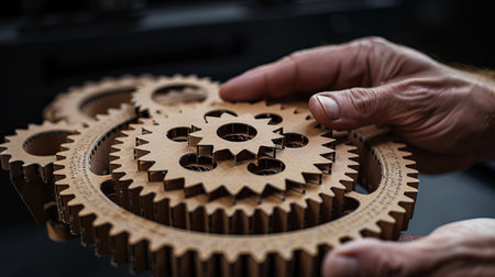Close-up of hands holding wooden gears, with focus on mechanical details, against a dark background, symbolizing teamwork concept. Generative AI