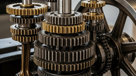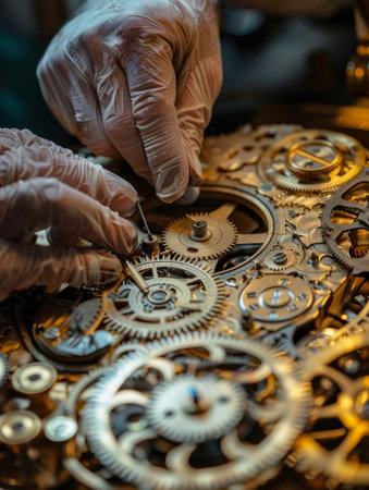 This close-up image showcases intricate metallic gears and cogs, highlighting the precision and complexity of modern machinery. The soft lighting emphasizes the fine details and craftsmanship, evoking a sense of technological advancement.