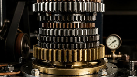 This close-up image features a stunning array of metallic gears, showcasing intricate details and a steampunk aesthetic, perfect for technology or industrial themes.