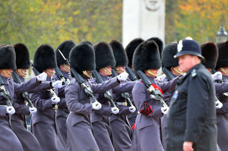 LONDON UNITED KINGDOM, OCTOBER 23 2018: the guards of the Buckingham Palace during the traditional Changing of the Guard ceremony London United Kingdom. Editorial use.