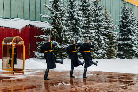 Changing of guard of honor at Moscow Kremlin in winter. Soldiers in military uniform. The famous place is Eternal Flame in memory of those killed in World War II. January 10, 2015 - Moscow, Russia.