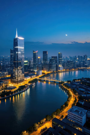 A stunning cityscape showcasing a grand bridge illuminated by vibrant lights at night. The calm river reflects the modern buildings, creating a serene ambiance.
