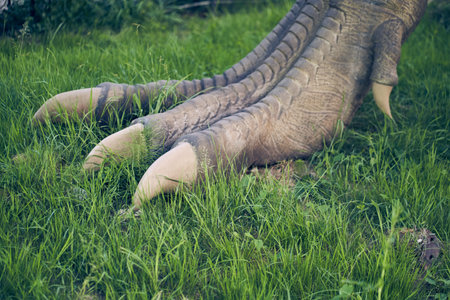 A realistic Tyrannosaurus rex paw in a Jurassic amusement park with space to copy. Paw on a background of green grass. High quality photo