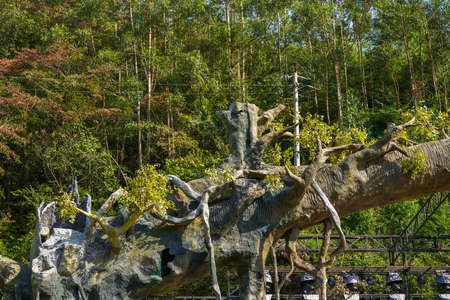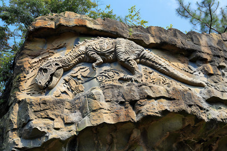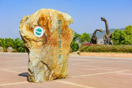 Yunnan, CHina - 21 March 2016: Jurassic Dinosaur Park stone landmark, at entrance, Yunnan, China