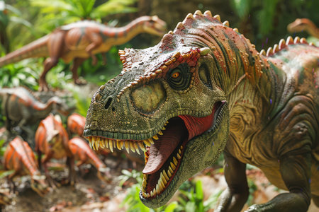 A detailed view of a dinosaur with its mouth wide open, showcasing its sharp teeth and powerful jaw muscles. The image captures the prehistoric reptile in a menacing pose, ready to strike or vocalize in its natural habitat.