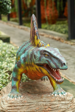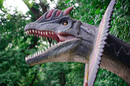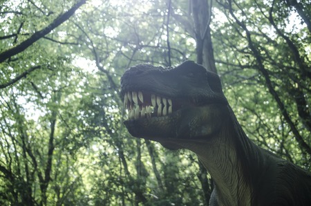 Close-up image of mean looking dinosaur in amusement dino park at Arboretum volcji potok near Radomlje in Slovenia.