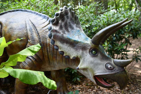 Close-up of an extinct Triceratops dinosaur made of rubber and metal. Animatronics and Robotics. Animated models of prehistoric creatures.