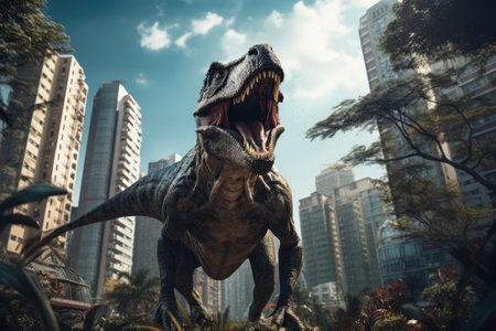 Fantasy 3D rendering of a Dinosaur in the middle of a modern city.