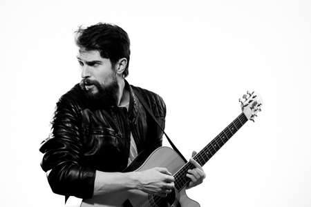 Emotional man with guitar music black leather jacket lifestyle light background