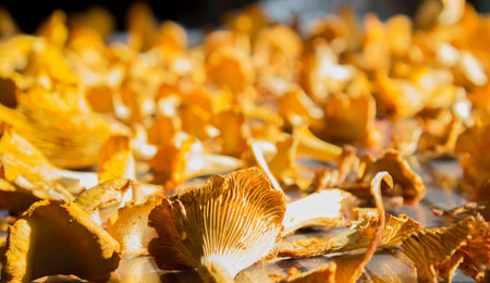 chanterelles are edible noble light yellow mushrooms laid out to dry for later storage. taken in close-up in the process.