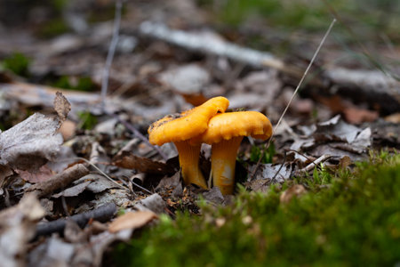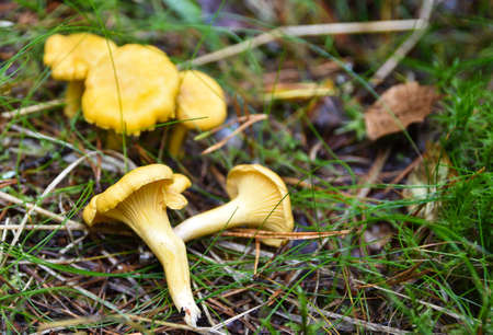 Chanterelle mushrooms growing in the forest. Selective focus.