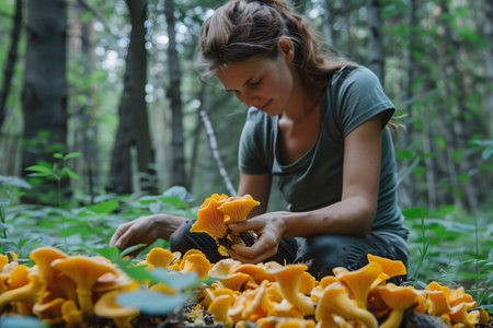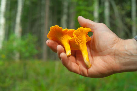 fresh chanterelle mushrooms in female teen hands, closeup photo