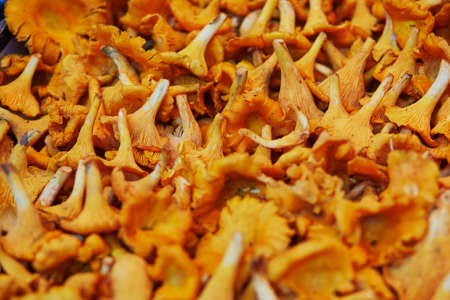Large heap of fresh ripe organic girolle mushrooms on farmer market in Paris, France