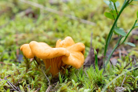 Edible and delicious chanterelle mushroom in the forest surrounded by green moss
