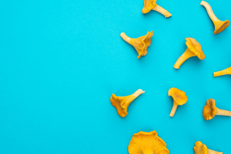 Yellow chanterelles on turquoise blue background with copy space. Minimalist photo of raw fresh golden chanterelles edible mushrooms.