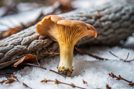 Chanterelle mushroom growing on snow in forest. Selective focus.